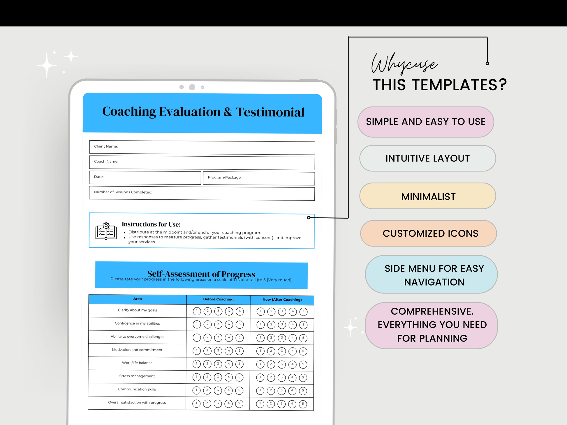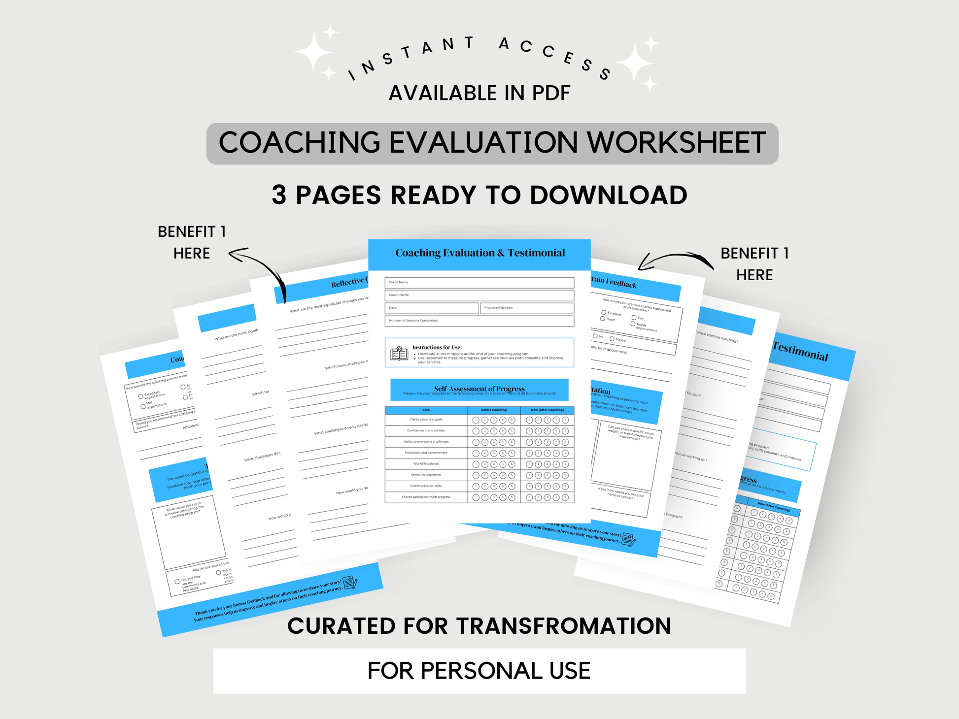 Introducing the Coaching Evaluation Template — your instant-download toolkit for turning coaching sessions into measurable progress. This digital resource is designed to capture client growth, gather insightful feedback, and invite authentic testimonials, all in a clean, ready-to-use format that fits right into your coaching workflow.