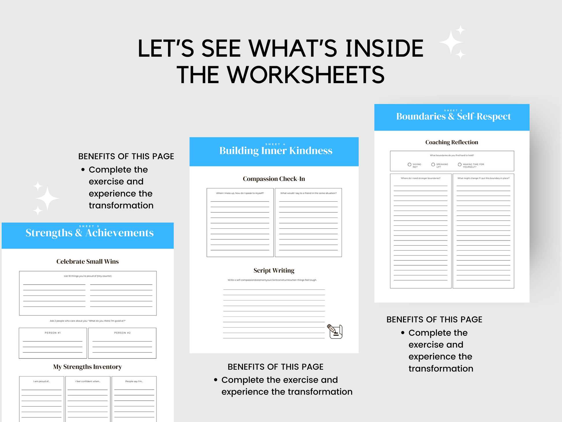• Guided prompts that prompt honest reflection, concrete rewriting of negative beliefs, and compassionate self-talk.