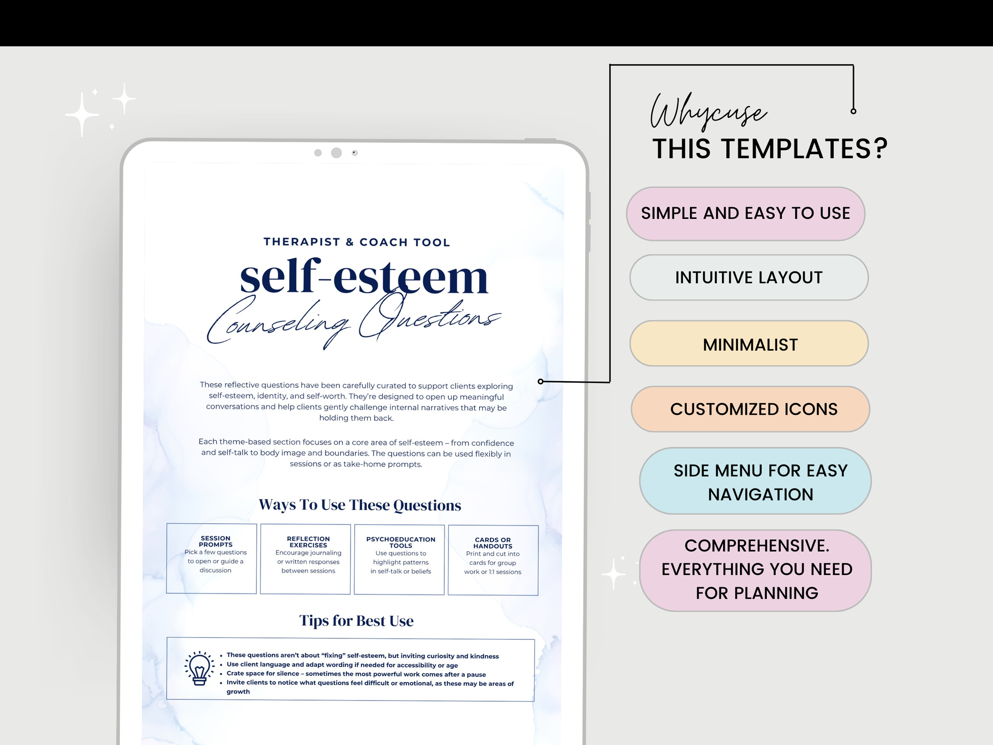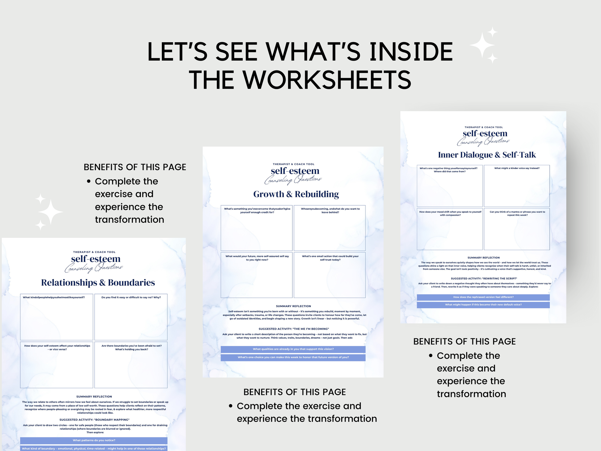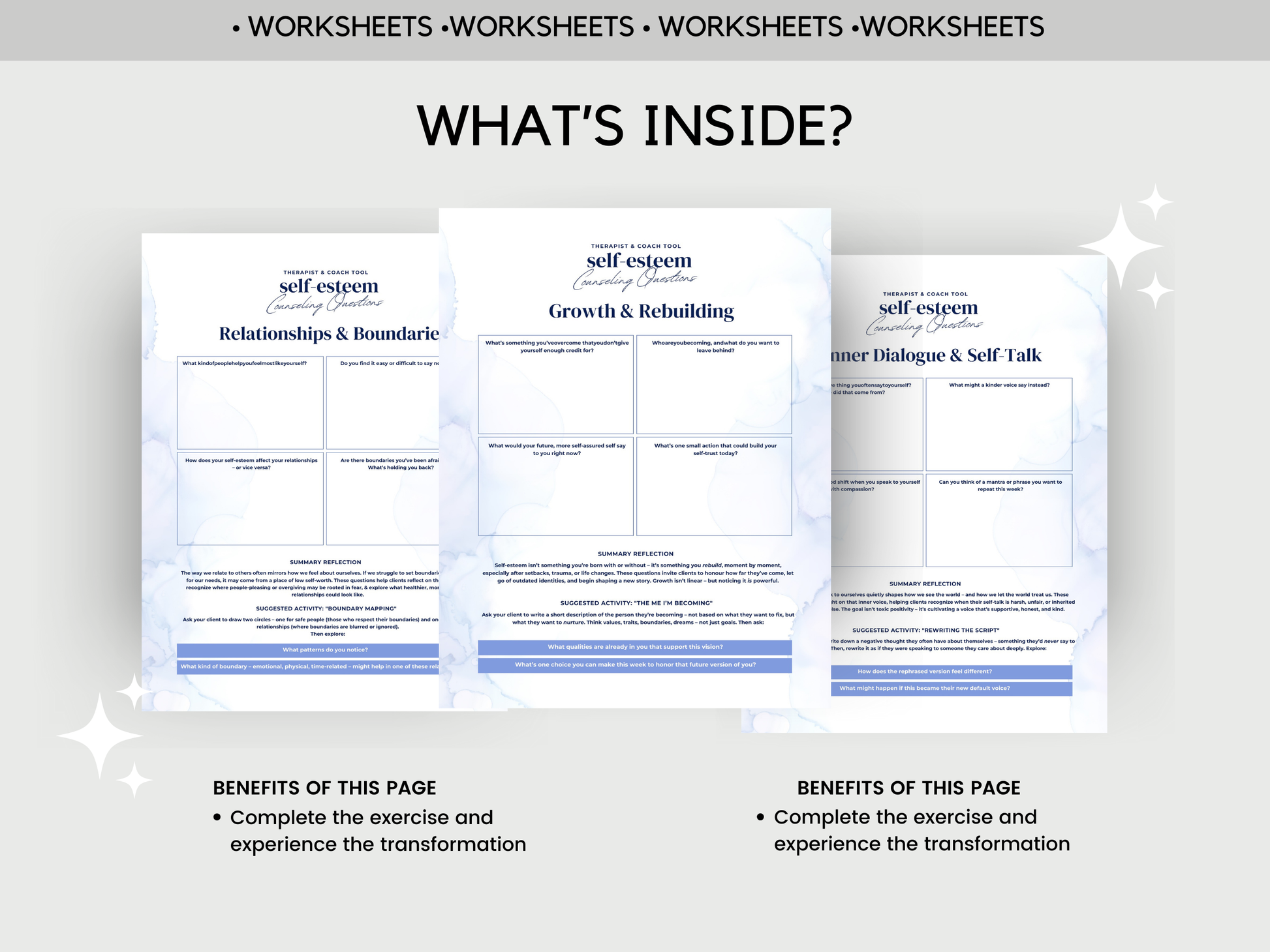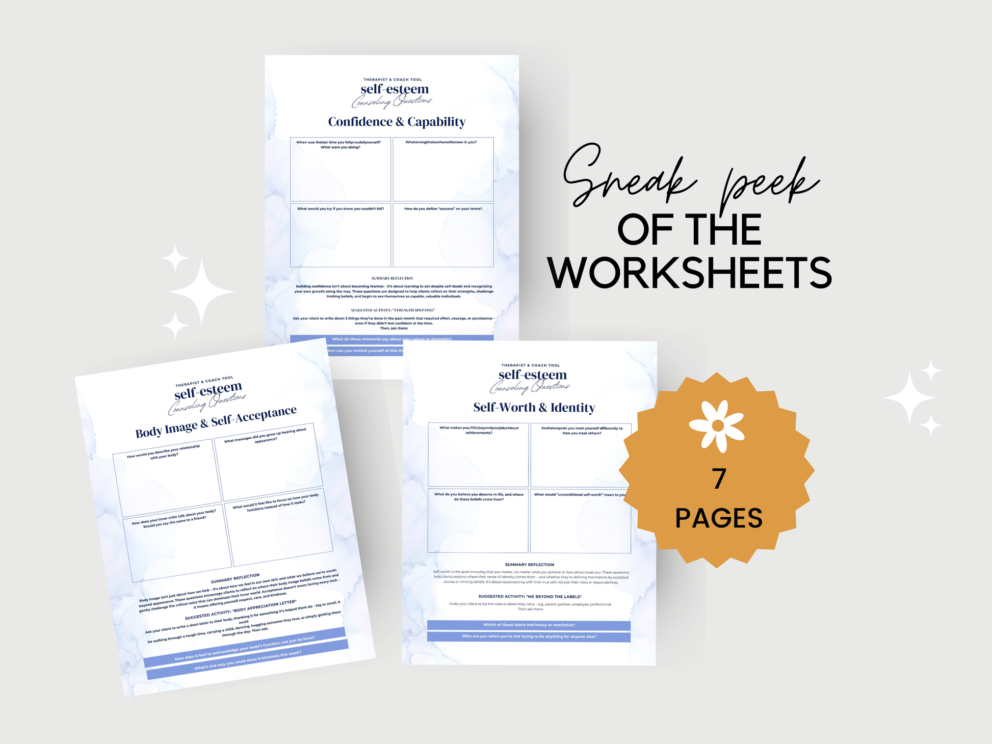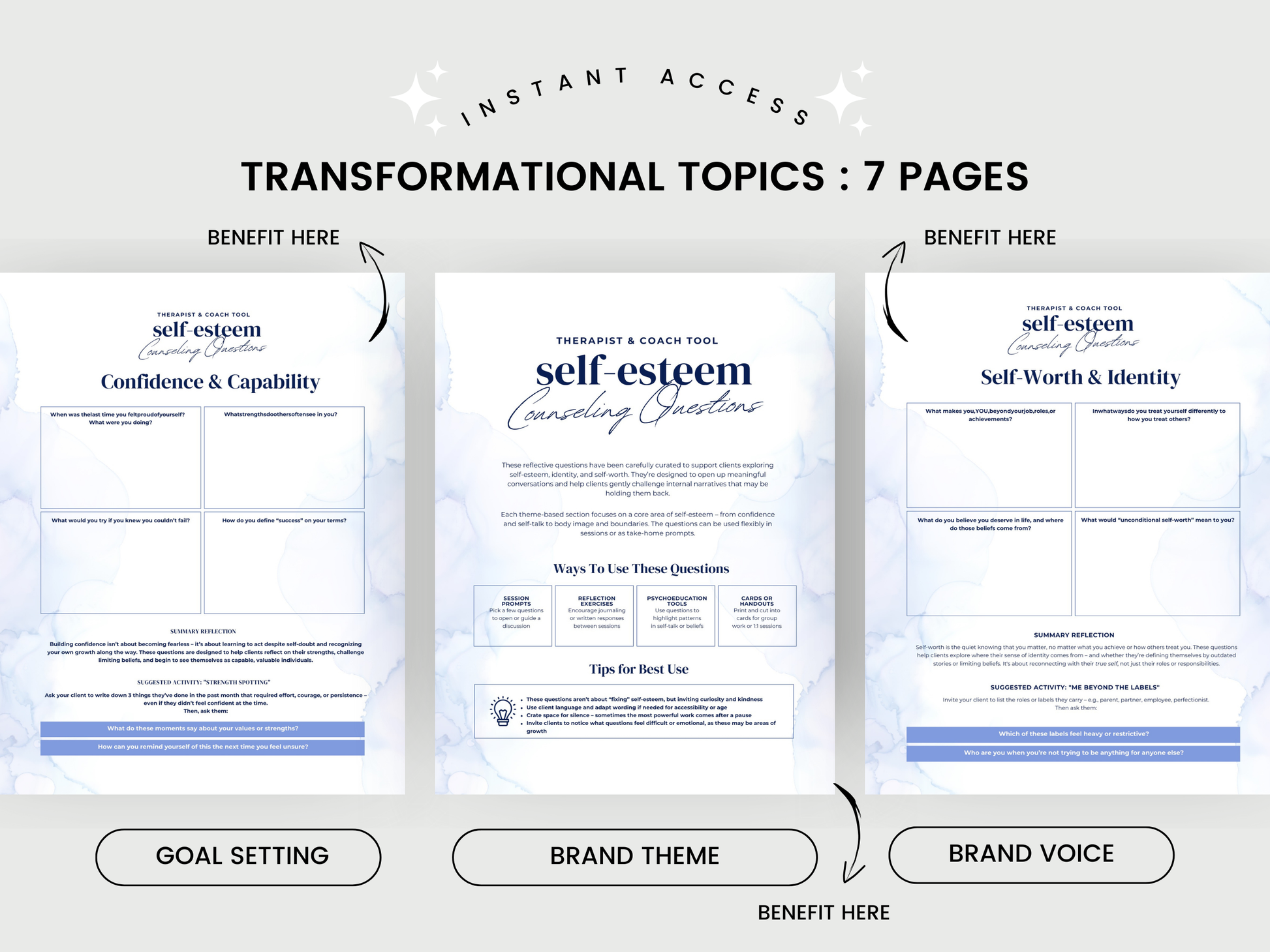 With an instant-download format, you can start exploring these Self-Esteem Counselling Questions right away—unlock deeper self-understanding, nurture a resilient self-image, and lay the groundwork for lasting personal growth.