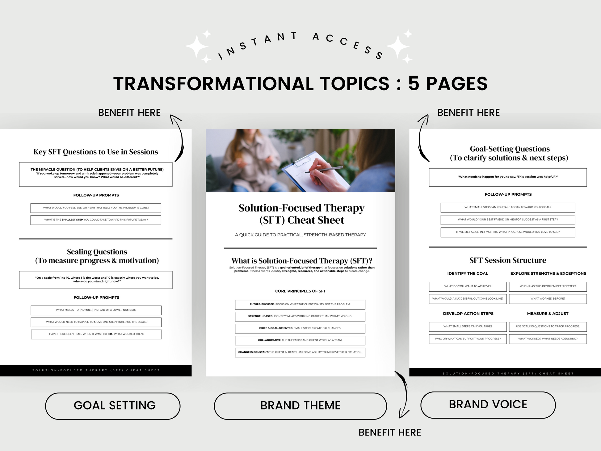 - Therapists, counselors, and coaches who practice Solution Focused Therapy and want an at-a-glance reference for sessions.